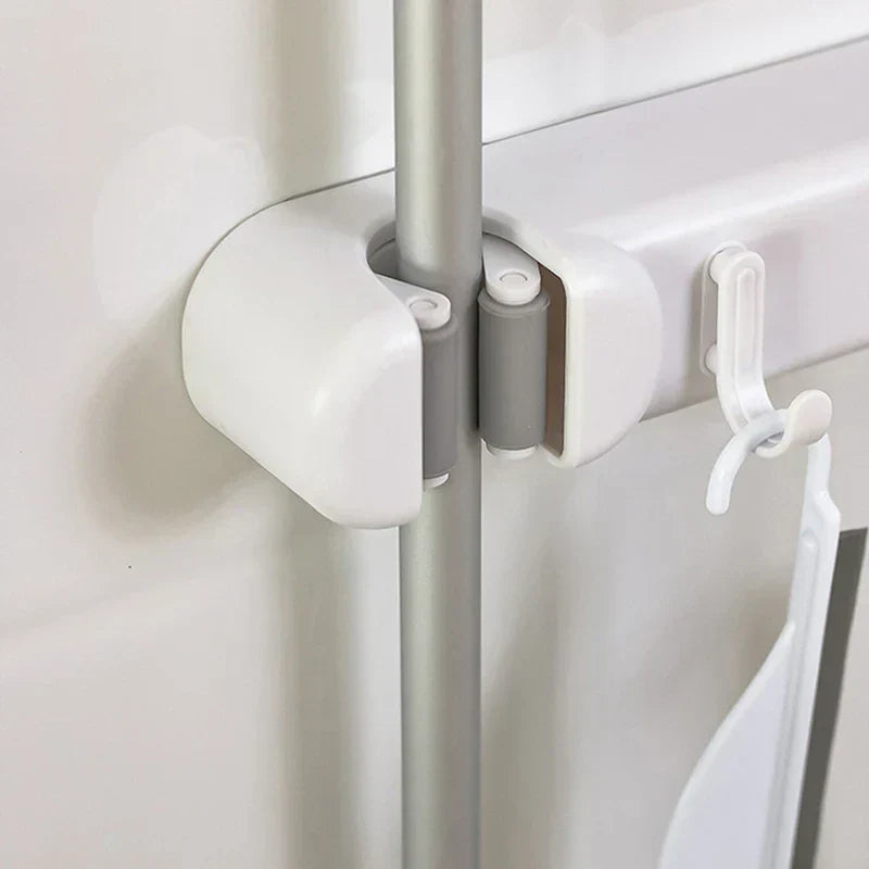 Securely store two mops or brooms and hang additional items with this Double Mop Broom Holder featuring a Hook. Wall-mounted for space-saving organization. From New Home Goods.