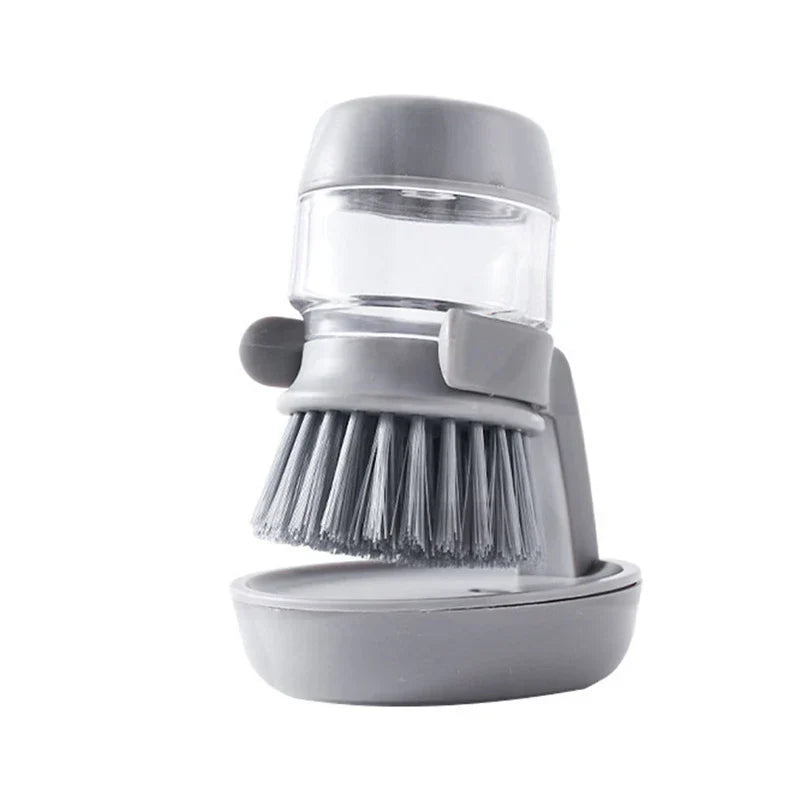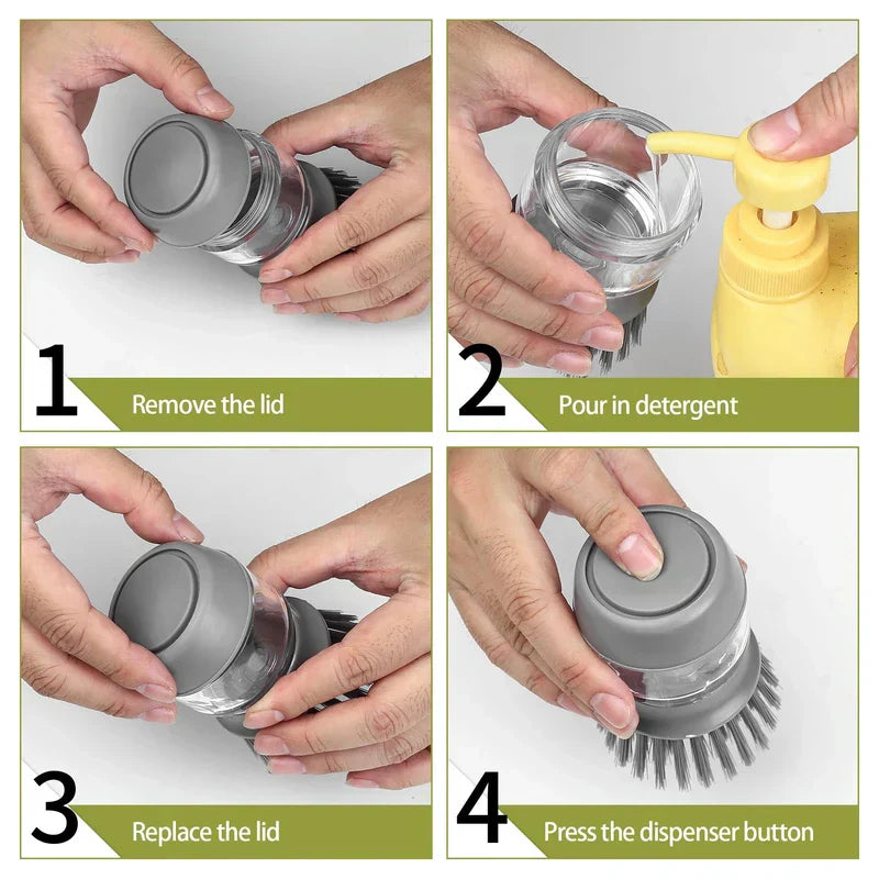 Scrub pots easily with this Hydraulic Soap Dispensing Pot Scrubber Brush. Features a mechanism (possibly hydraulic press) to dispense soap while scrubbing. Offered by New Home Goods.