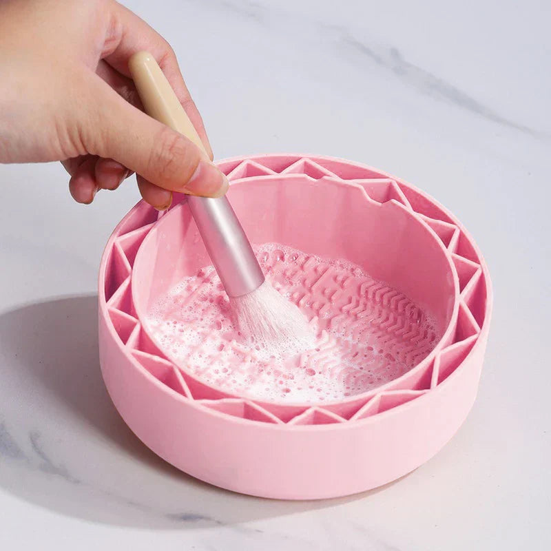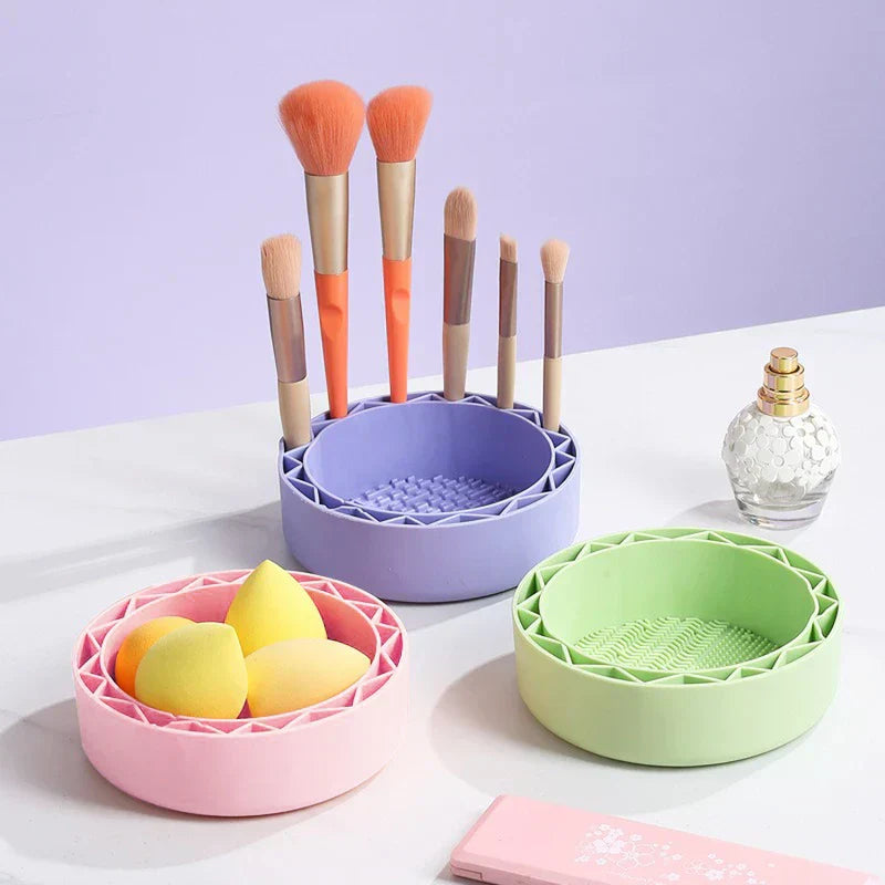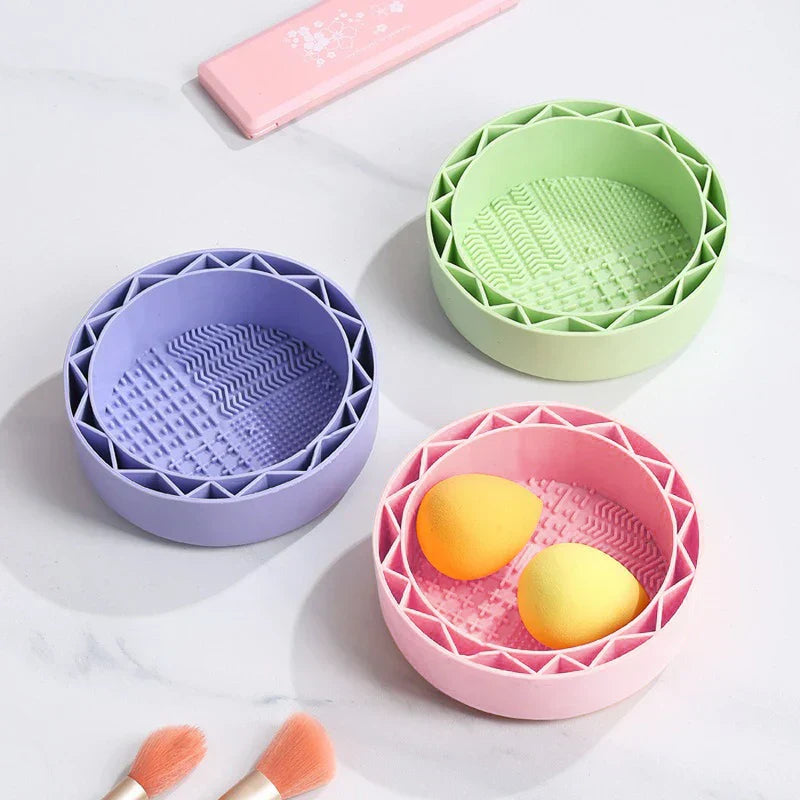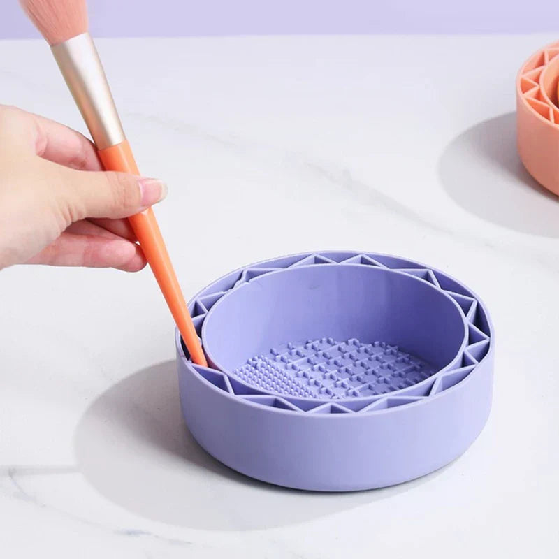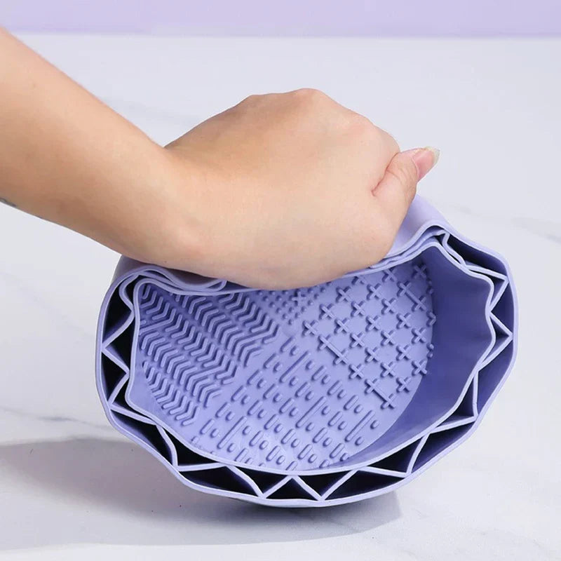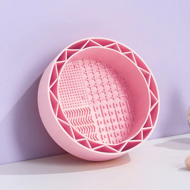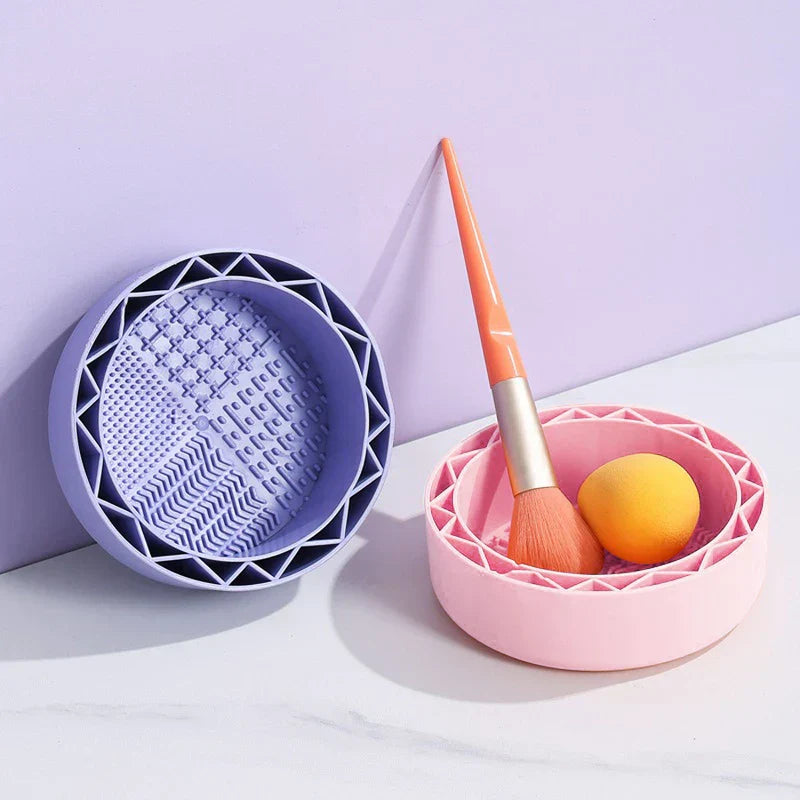 Clean makeup brushes thoroughly using this Makeup Brush Cleaning Scrubber Bowl Mat. Features textured surfaces within a bowl or mat for deep cleaning bristles. From New Home Goods.