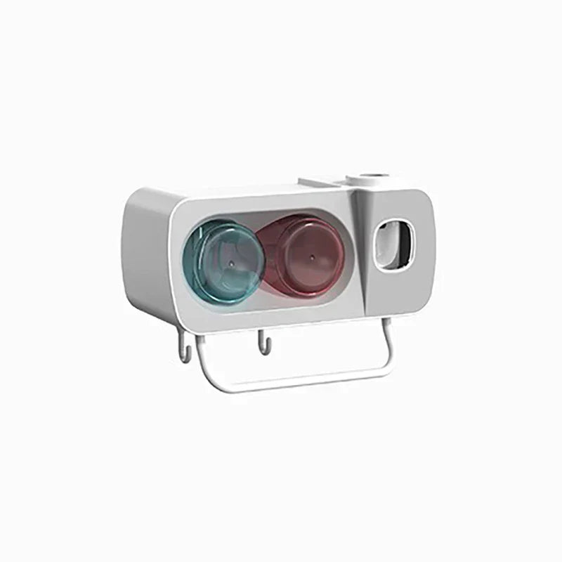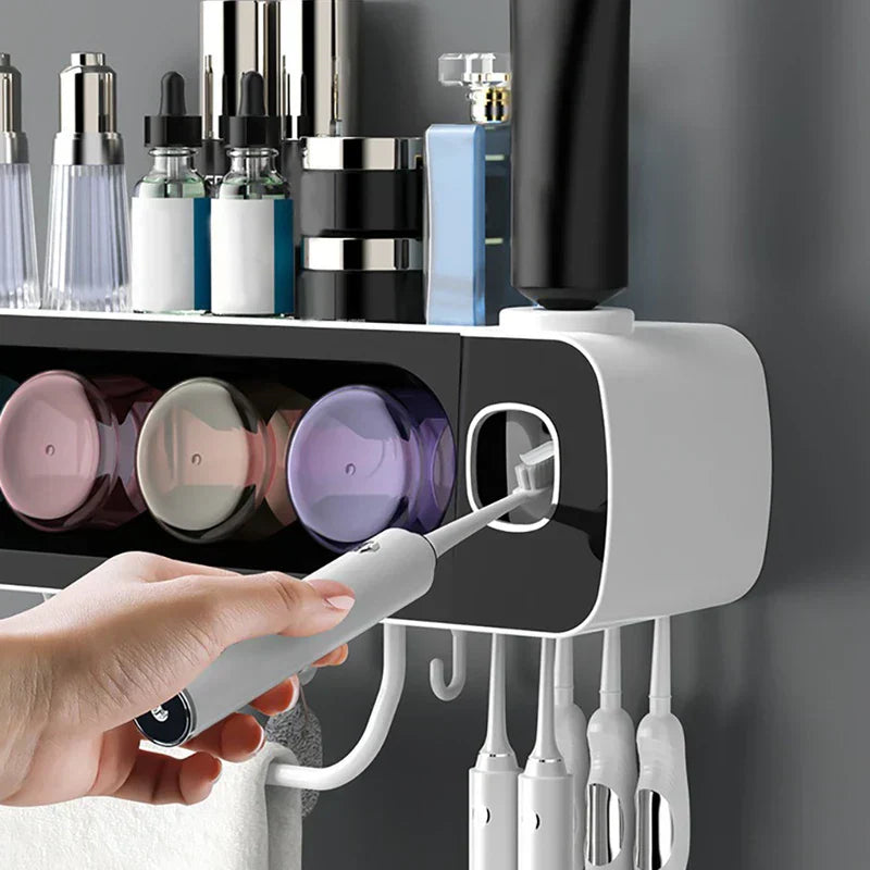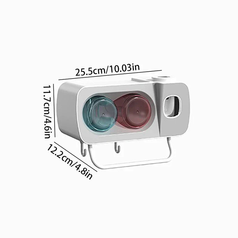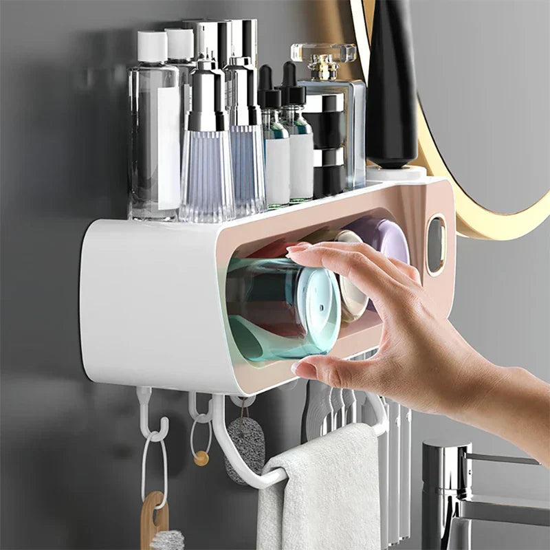 Organize multiple bathroom essentials with this Multifunctional Toothbrush Holder Wall Mount. Likely holds toothbrushes, toothpaste, and potentially cups or other items. Offered by New Home Goods.